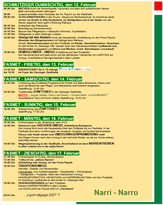 Wie Sie aus unserem Fasnet-Terminkalender entnehmen können, ist bei uns über die närrischen Tage einiges geboten und es würde uns freuen, wenn wir Sie bei einer unserer Veranstaltungen begrüßen dürften.